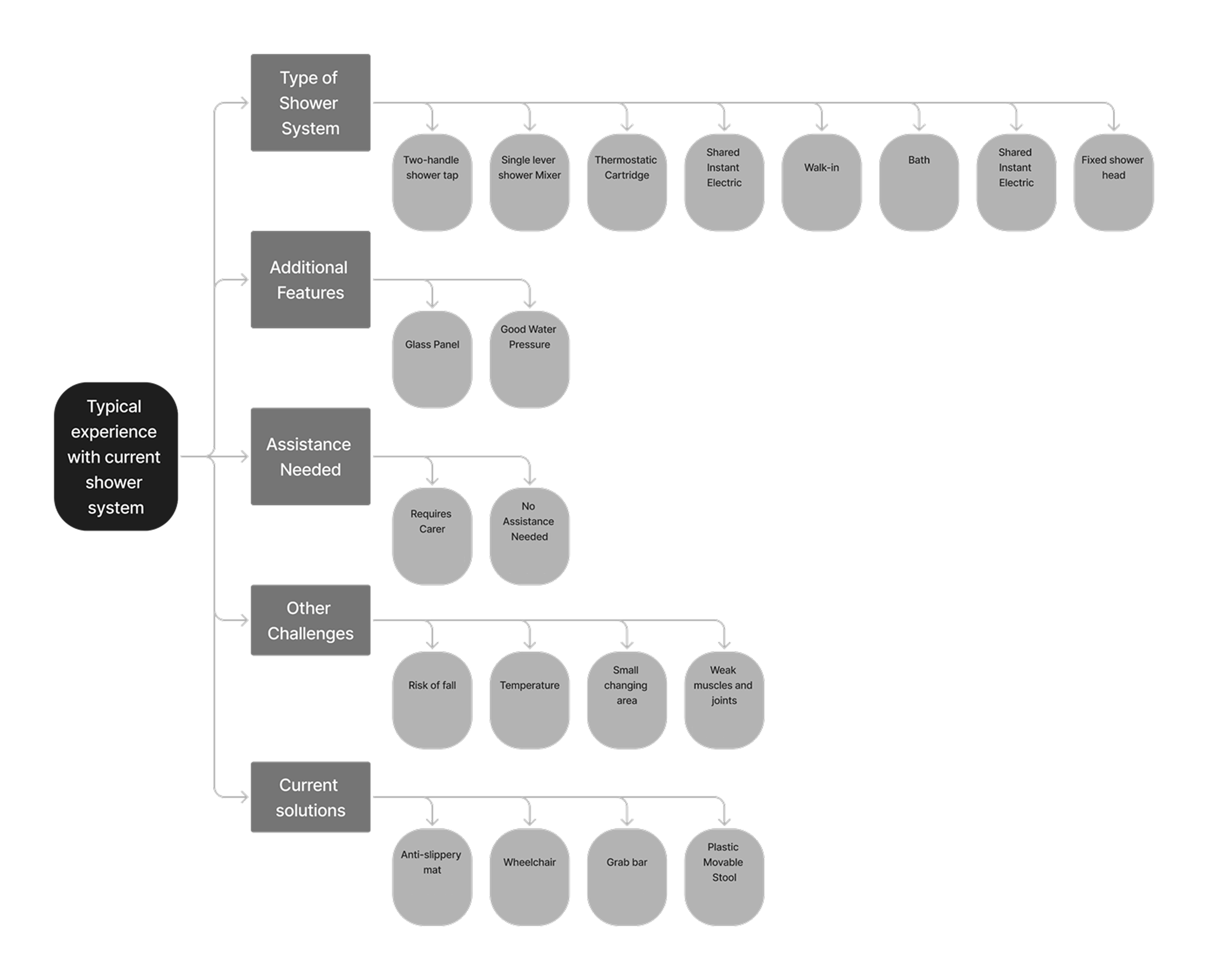 Used a mixed-methods approach combining background research, qualitative content analysis, semi-structured interviews, and iterative prototyping. Each phase built on the last; uncovering accessibility barriers in existing smart showers, testing three interaction models with older adults, and refining designs through expert evaluation. This process produced measurable usability gains (83% task completion, 17% error rate) and actionable, expert-validated accessibility guidelines.